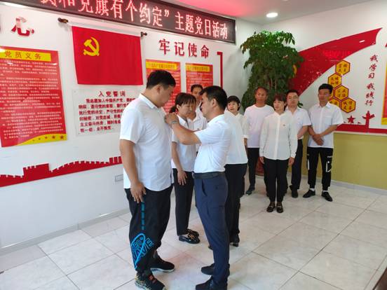 在馬林林場分會場,2名老黨員正在為預備黨員佩戴黨徽,這光榮的儀式對于新黨員來說是一種榮譽、一種激勵、一種鞭策,更是中國共產黨人精神的傳承。