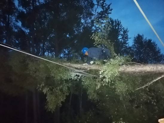 飛機巡查發(fā)現(xiàn)的呼碧線128號電線桿和129號電線桿之間線路故障處,由呼中輸電運檢班組負責搶修,需搶修人員步行穿過密林和水道,經(jīng)過1個多小時的艱難跋涉方能到達,現(xiàn)場電線上掛著一棵直徑40多厘米的風倒樹,導(dǎo)致電線破損,搶修人員將風倒樹用手鋸切割移除,并對破損電線進行補強,截至21時30分,呼碧線兩處故障全部搶修完畢,呼中區(qū)陸續(xù)完成供電。