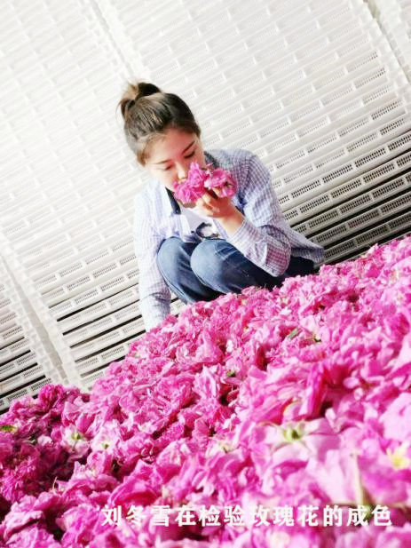 今年32歲的劉冬雪,從小就看著外公王占龍帶領父親及家人試種玫瑰花,剛開始種植品種單一,種植面積小,玫瑰產(chǎn)量低。2009年,正在讀高中的劉冬雪,在外公和父親的影響下,加入到玫瑰花種植工作中,幫助老輩管理生產(chǎn)、銷路、產(chǎn)品創(chuàng)新等多個環(huán)節(jié)。劉冬雪有文化、肯專研,女孩子對玫瑰花更是情有獨鐘,父輩一商量將合作社經(jīng)理的重擔就交給了她。劉冬雪深知近年隨著玫瑰面積和產(chǎn)量的不斷提高,他們還是家庭小作坊模式,“單打獨斗”地跑市場,只能是小打小鬧。為此,她跑市場、找銷路、先后到云南、山東等地考察,了解鮮花生產(chǎn)和銷售。并函授學習了林農(nóng)大專課程,不斷更新鮮花品種,提升鮮花品質,逐步打開了鮮花銷路。劉冬雪也深入思考,只賣原材料經(jīng)受不了市場的考驗,她夢想建一個玫瑰花深加工企業(yè),但是,因缺少資金遲遲沒有實現(xiàn)心中的愿望。