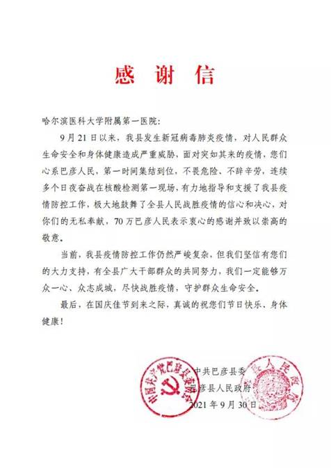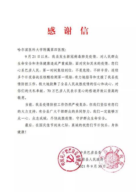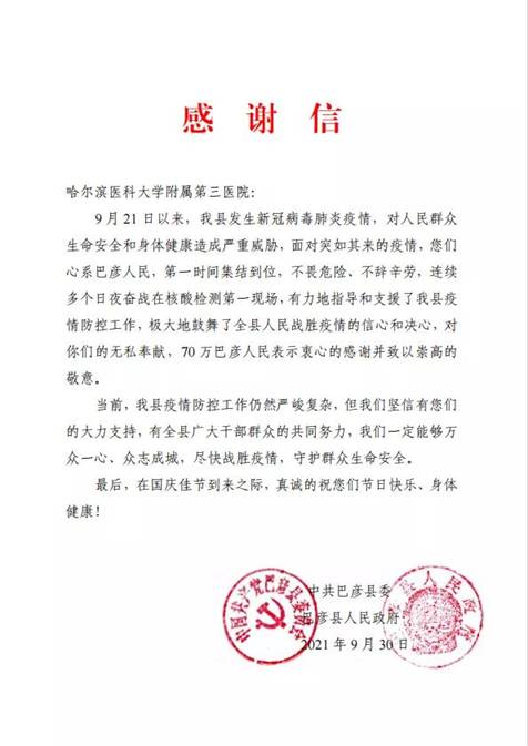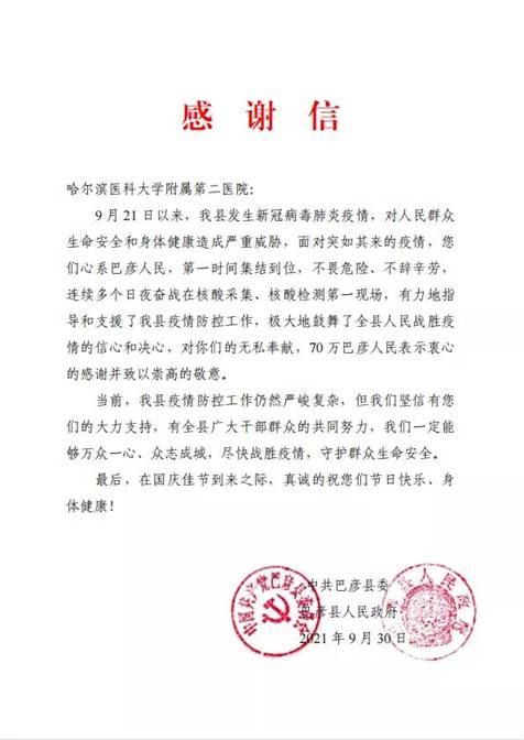 黑龍江經(jīng)濟(jì)網(wǎng)訊(黑龍江日?qǐng)?bào)全媒體見(jiàn)習(xí)記者董廣碩 商祺)近日,哈爾濱醫(yī)科大學(xué)附屬一院、二院、腫瘤醫(yī)院、四院分別收到巴彥縣委縣政府的感謝信,感謝他們“有力地指導(dǎo)和支援了我縣疫情防控工作,極大地鼓舞了全縣人民戰(zhàn)勝疫情的信心和決心。”