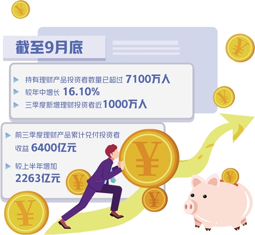 而且,隨著居民財(cái)富的不斷積累,投資者的理財(cái)意識(shí)顯著增強(qiáng),銀行理財(cái)投資者人數(shù)持續(xù)增長(zhǎng),截至9月底,持有理財(cái)產(chǎn)品投資者數(shù)量已超過7100萬(wàn)人,較年中增長(zhǎng)16.10%,僅三季度新增理財(cái)投資者近1000萬(wàn)人。在轉(zhuǎn)型過程中,理財(cái)產(chǎn)品的投資收益也穩(wěn)中有升,前三季度理財(cái)產(chǎn)品累計(jì)兌付投資者收益6400億元,較上半年增加2263億元。