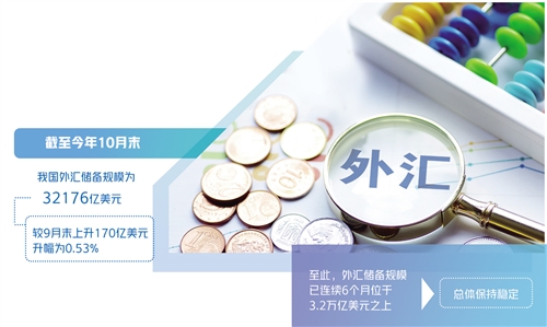 近日,國家外匯管理局公布的最新外匯儲備規(guī)模數(shù)據(jù)顯示,截至今年10月末,我國外匯儲備規(guī)模為32176億美元,較9月末上升170億美元,升幅為0.53%。至此,外匯儲備規(guī)模已連續(xù)6個(gè)月位于3.2萬億美元之上,總體保持穩(wěn)定。