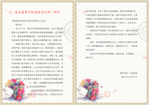 據(jù)介紹,省醫(yī)院支援黑河應(yīng)急醫(yī)療隊(duì)共收治新冠肺炎患者69人,其中重癥1例,最小的患者2歲,最大的患者90歲,在兄弟單位接手前,共治愈出院35人。治療期間,醫(yī)療隊(duì)收到了多封患者表?yè)P(yáng)信,小患者們則用畫(huà)筆表達(dá)了對(duì)天使們的感謝與敬仰,有的未出院患者聽(tīng)說(shuō)省醫(yī)院醫(yī)療隊(duì)要離開(kāi)了,都依依不舍,紛紛表達(dá)對(duì)醫(yī)療隊(duì)精湛的醫(yī)技和暖心醫(yī)療的感謝。