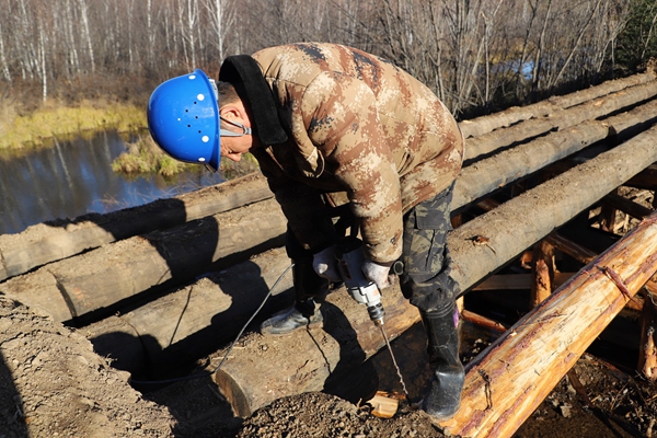 阿木爾林業(yè)局多種經(jīng)營公司職工李訓武在修復(fù)水毀橋梁(王力 攝)