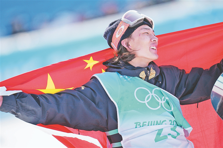 2月15日,中國選手蘇翊鳴在奪冠后慶祝。 當(dāng)日,北京2022年冬奧會單板滑雪男子大跳臺決賽在北京首鋼滑雪大跳臺舉行。中國選手蘇翊鳴奪得金牌。 新華社記者 李一博攝