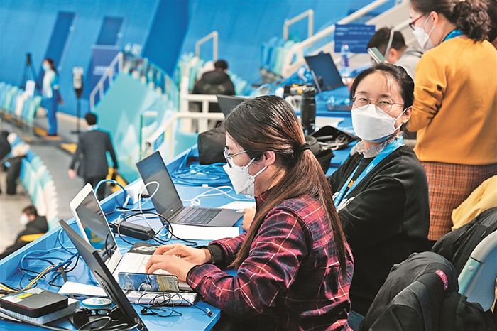 本報特派記者在冰絲帶現(xiàn)場寫稿。