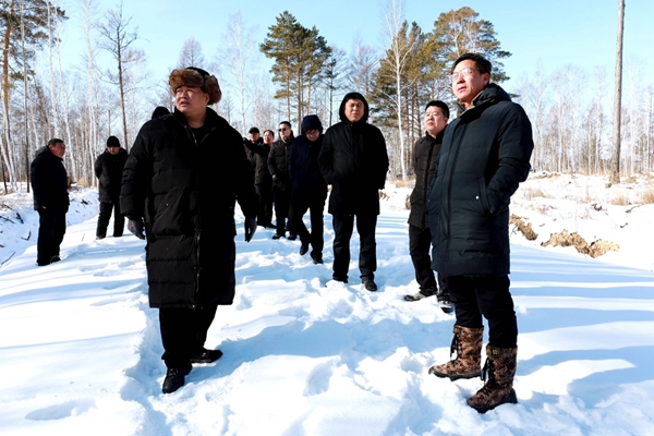 阿木爾林業(yè)局由林業(yè)局黨委書記胡守慶(最前排左),林業(yè)局黨委副書記、局長(zhǎng)韓鳳泉(最前排右)組成體驗(yàn)式調(diào)研組,深入北極島調(diào)研旅游產(chǎn)業(yè)(王力 攝)