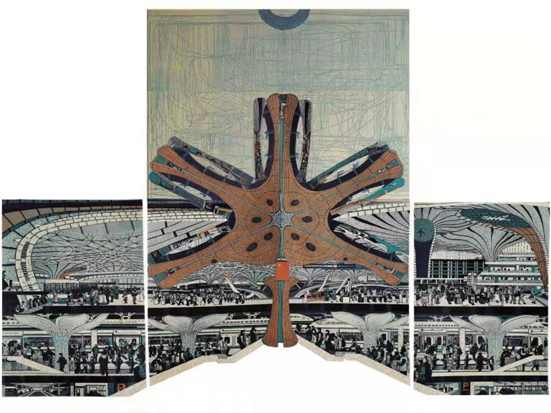 版畫作品《鳳凰展翅——北京大興國際機場》描繪了北京大興機場如鳳凰展翅、騰飛天際的恢宏景象。畫家采用空間翻轉(zhuǎn),將機場內(nèi)外現(xiàn)代化、人性化、藝術(shù)化的先進設(shè)施和繁忙的國際交流同時表現(xiàn)出來。