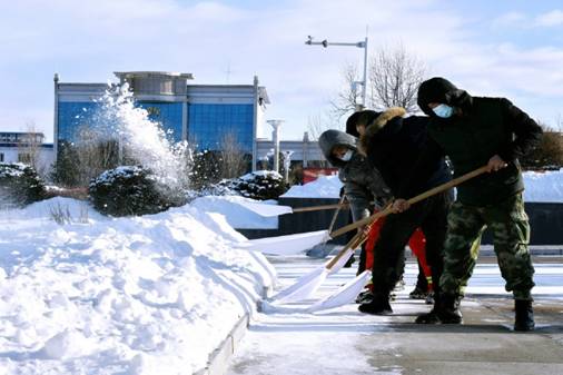 皚皚白雪中,190余名隊員不畏嚴(yán)寒,有的將冰層鏟起,有的則用鐵鍬將積雪運(yùn)至道路兩側(cè)不影響交通的地方。大家齊心協(xié)力逐段清理、有序推進(jìn)清雪工作,不到10:30就為附近干部職工群眾創(chuàng)造了一個安全、順暢、良好的生產(chǎn)生活環(huán)境。