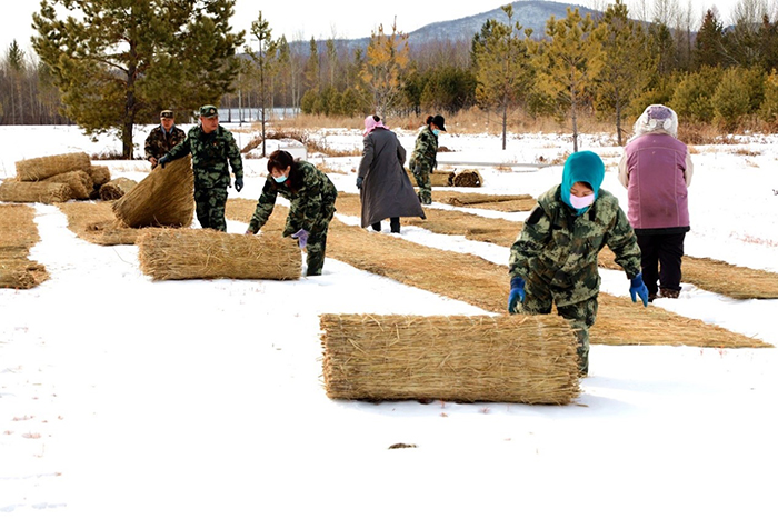 一年之計(jì)在于春。林業(yè)局中心苗圃針對(duì)興安落葉松、樟子松、西伯利亞紅松新播苗因受凍拔影響,導(dǎo)致苗木根部留露地面而枯死的實(shí)際問題,組織機(jī)關(guān)工作人員利用周末兩天時(shí)間,以義務(wù)獻(xiàn)工,對(duì)180萬余株苗木鋪蓋草簾子近5000延長(zhǎng)米。