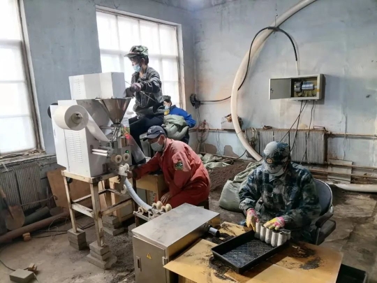 根據(jù)設備操作指南,呼中林業(yè)局中心苗圃從3月中旬便開始著手生產(chǎn)作業(yè),工作中他們采用機械與人工相結合的方式,每天加班加點、技術人員跟班作業(yè)。同時,為加快生產(chǎn)進度,他們還租用一臺挖掘機,將凍土原料運送到圃內(nèi)大棚,并用燒爐解凍烘干的方法,與珍珠巖肥料按一定比例混合成基制,再用機器灌裝成型,每日生產(chǎn)可達8000余個。截至目前,已完成輕基質容器育苗杯生產(chǎn)10萬+。