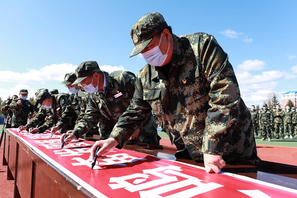 阿木爾林業(yè)局處級(jí)領(lǐng)導(dǎo)在印有“牢記歷史 警鐘長(zhǎng)鳴 奮發(fā)圖強(qiáng) 建設(shè)美麗家園”的宣傳條幅上簽名(王力 攝)