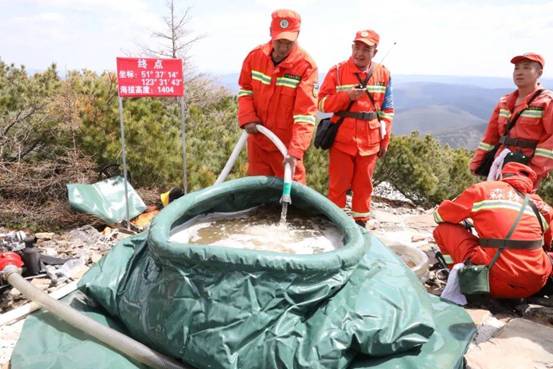 據了解,此次演練模擬小白山最高峰海拔1404米的“興安第一塔”附近偃松林發(fā)生火情,在海拔886米尋找到一處水源地,撲火隊員利用高揚程山地引水泵向1150米處放置的儲水囊供水,同時架設第二臺水泵向山頂供水,兩臺水泵交叉接力成功將水引向小白山最高峰,噴淋“興安第一塔”,整個過程鋪設水帶全長3740延長米,垂直爬高519米。