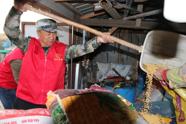 接著大家又來到明桂琴和程少和老人家中。在明桂琴老人家中,黨員同志們一走進院子,正趕上老人家中的糧食沒有碼放好灑了一地,大家立刻七手八腳的把糧食收好裝入袋中。在隨后的座談慰問中,老人回想起這些年工作隊的同志們對自己的熱心幫扶,感動得熱淚盈眶。