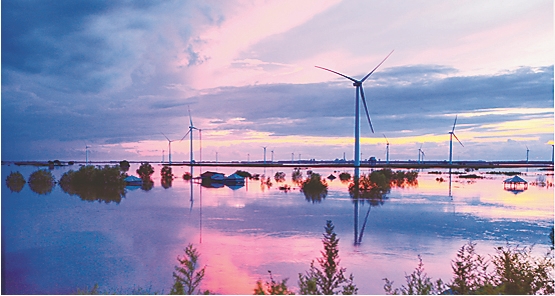 綏濱縣“平原風(fēng)電之都”高聳旋轉(zhuǎn)的風(fēng)車。