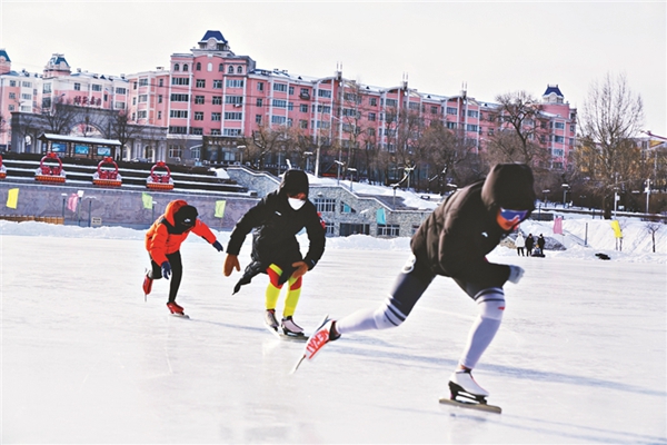 在中俄體育公園,8000平方米的滑冰場(chǎng)聚集了綏芬河市冰球運(yùn)動(dòng)愛(ài)好者和青少年速度滑冰愛(ài)好者,他們最小的6歲,最大的50多歲。在冰球運(yùn)動(dòng)展示活動(dòng)中,頭戴球盔、身披護(hù)具的孩子們斗志昂揚(yáng),踏上冰場(chǎng)的他們?nèi)缤荣惖倪x手一樣,來(lái)去如風(fēng)穿梭自如,既帥又酷,團(tuán)隊(duì)配合對(duì)抗激烈。剛在對(duì)方球門(mén)前射門(mén),一眨眼工夫,球已經(jīng)到了另一方球門(mén)前。速度滑冰愛(ài)好者們你追我趕,激情享受這一北方冬天特有運(yùn)動(dòng)帶來(lái)的樂(lè)趣?;鶒?ài)好者王瑞說(shuō):“我非常喜歡在冰上飛馳的感覺(jué),我最喜歡冬天了,冬天會(huì)有冰場(chǎng),大家可以在一起滑冰,一起交流,一起歡笑。”
