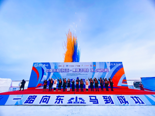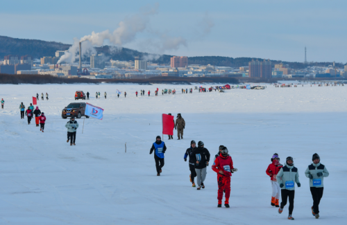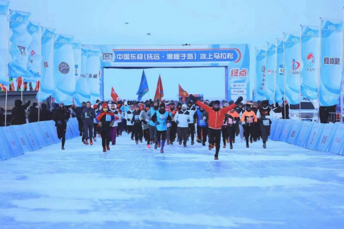 中國東極(撫遠(yuǎn)·黑瞎子島)冰上馬拉松賽已經(jīng)連續(xù)五屆在撫遠(yuǎn)市舉辦,憑借地域唯一性和極限挑戰(zhàn)性,成為全球五大冰上馬拉松之一,開創(chuàng)中國極限冰雪馬拉松運動的先河。本屆賽事由黑龍江省體育局、佳木斯市人民政府主辦,省政府黑瞎子島建設(shè)和管理委員會、撫遠(yuǎn)市人民政府承辦。中國奧委會副主席、中田協(xié)名譽主席段世杰前往比賽開幕式鳴槍。賽事設(shè)有全程馬拉松、半程馬拉松、新年歡樂跑三個項目。清晨7點,撫遠(yuǎn)市的氣溫達到了零下23.3攝氏度,選手們紛紛帶上防風(fēng)面罩、保暖帽、手套、太陽鏡、防滑冰爪等應(yīng)對極端嚴(yán)寒環(huán)境下的特殊裝備,在全程42.195公里的冰賽道上,徒步穿越冰雪世界,體驗當(dāng)?shù)鬲毺乇┪幕兔袼罪L(fēng)情,品嘗賽道補給站提供的熱氣騰騰的鱘鰉魚鍋、鮮鯽魚湯等地方特色補給品,補充能量抵御嚴(yán)寒。