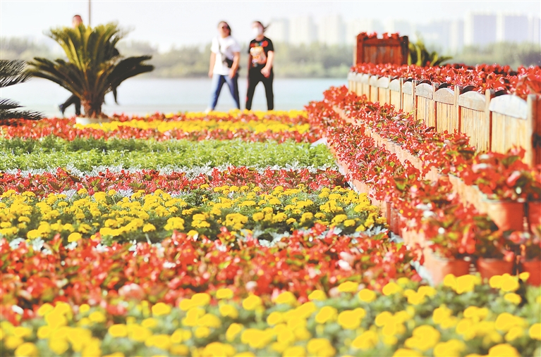 5月21日,哈爾濱市道外區(qū)江畔景陽廣場上,數(shù)千株五顏六色的花卉構成了一座美麗的大花壇,有黃色的菊花、紅色的四季海棠、白色的雪葉蓮等,姹紫嫣紅,爭奇斗艷,將廣場裝點得分外美麗,吸引了許多市民、游客駐足觀賞拍照。