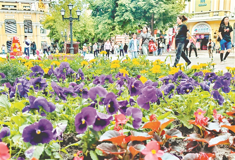 13日,哈爾濱市道里區(qū)中央大街上,行人從五彩繽紛的花卉旁走過。進入夏季,來哈爾濱避暑游玩的游客不斷增多,為給游客打造一個舒適美麗的旅游環(huán)境,中央大街上種植了三色堇、金魚草、矮牽牛、四季海棠等多種花卉。這些鮮花姹紫嫣紅、爭奇斗艷,將整條街道裝點得十分靚麗。