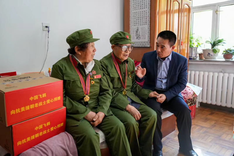 飛鶴乳業(yè)黨委書記朱天龍(右)帶領(lǐng)工作人員看望抗美援朝老戰(zhàn)士