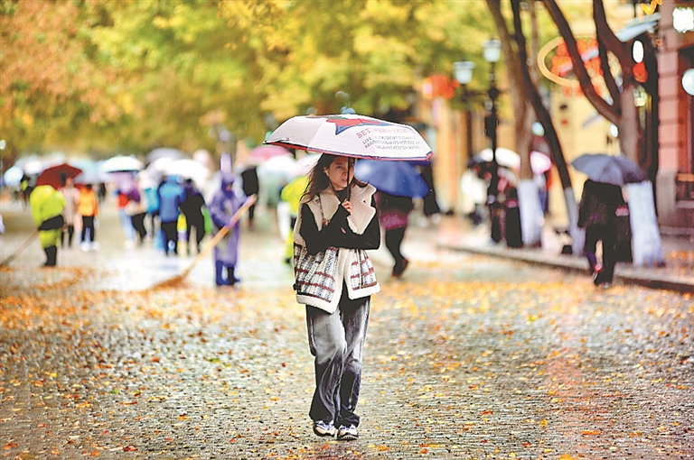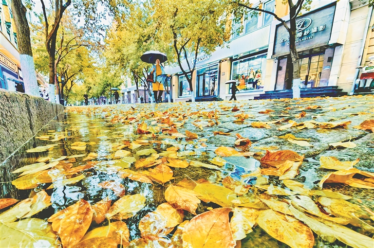 雨中秋意濃。10日一場秋雨,哈爾濱街道兩側的樹葉紛紛飄落,滿地落葉如同一層金色地毯,為秋日冰城增添了更多魅力。外出的人們撐起五顏六色的雨傘,走在落葉間,構成了一幅幅美麗的油畫。