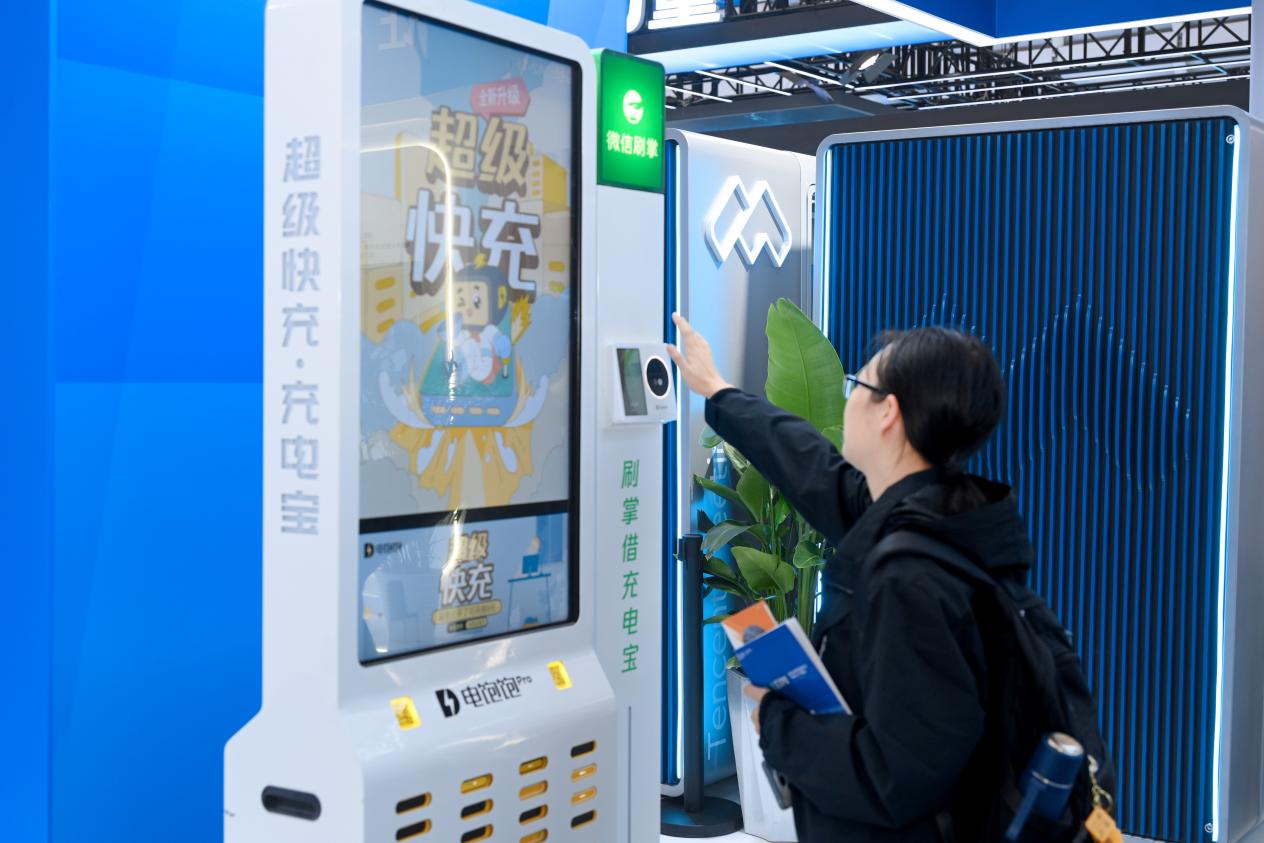 圖為參觀者體驗刷掌借充電寶