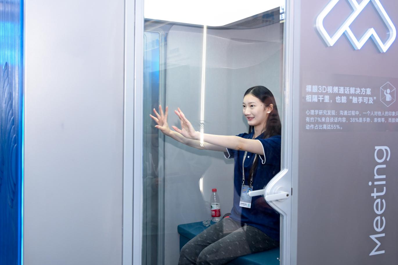 圖為參觀者體驗騰訊會議裸眼3D通話艙