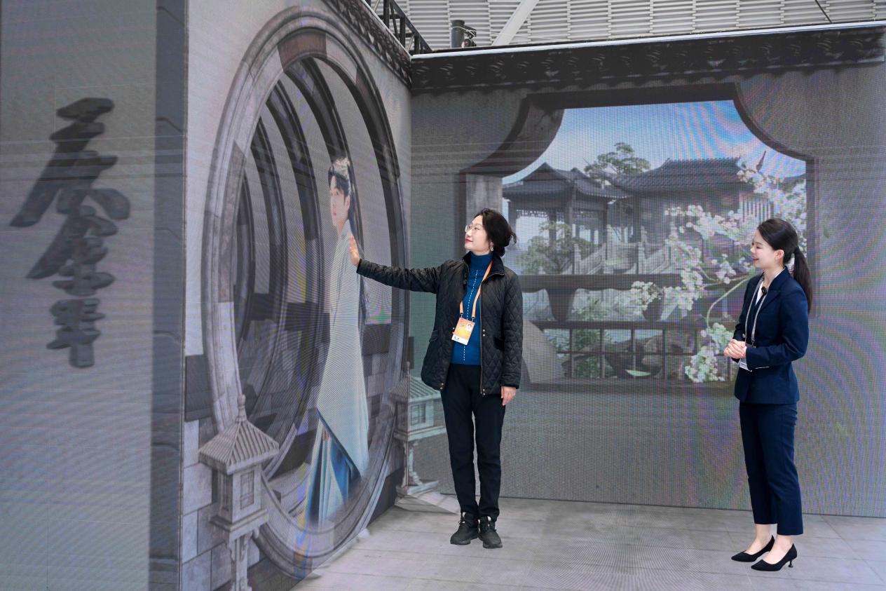 文化板塊,是騰訊本次展會的一大亮點。在“騰訊文化IP盒子”中,集合騰訊文學(xué)、影視、音樂、游戲、電競、動漫六大板塊的文化產(chǎn)業(yè)集群躍然眼前。在以裸眼3D模式呈現(xiàn)的三面屏中,觀眾可以一覽騰訊文化產(chǎn)業(yè)的全球布局,走入《慶余年》《繁花》等IP經(jīng)典場景中進(jìn)行合影,并通過現(xiàn)場設(shè)置的AI智能體,與劇中的虛擬角色實時語音互動。