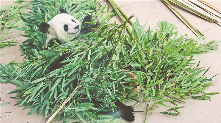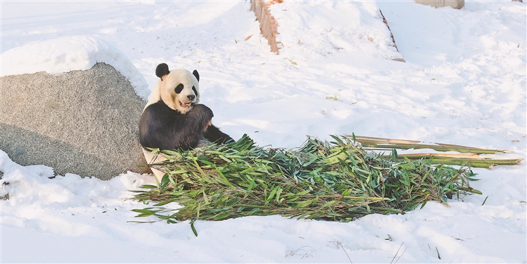 尤其是“佑佑”,曬著午后暖陽(yáng),坐在室外的雪地里,大口“狂炫”竹葉,這一口吃夠了,就尋覓著從雪里刨出來(lái)一根竹筍,秒變“剝筍小哥”。“佑佑”還時(shí)不時(shí)停下來(lái),盯著人群定格幾秒,仿佛是專(zhuān)門(mén)為游客拍照擺好姿勢(shì),令不少南方小伙伴感嘆“開(kāi)了眼界”。