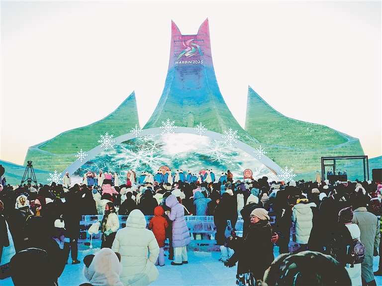 精美與靈動相互交織,園區(qū)內亞冬會氛圍濃厚。“我們在園區(qū)內看到很多亞冬會元素的冰雪景觀,像雪雕‘濱濱’‘妮妮’、會徽大地景觀等,準備逐個打卡?!鄙綎|游客許多開心地說。
