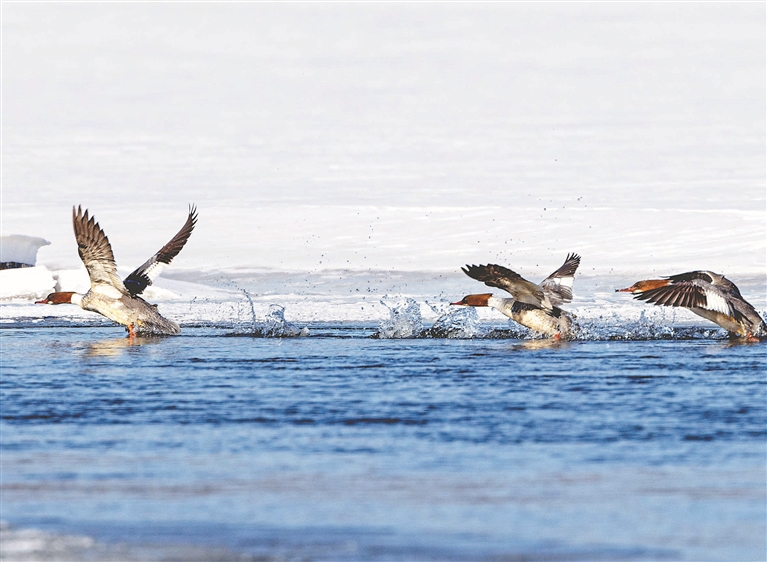 本報(bào)訊(黃曉光 記者郭俊峰)近日,國(guó)家一級(jí)保護(hù)動(dòng)物秋沙鴨翩然而至,為小興安嶺的初春增添了別樣生機(jī)。它們?cè)诔纬旱乃嫔嫌迫挥芜瑫r(shí)而將頭扎進(jìn)水里,探尋著水下的美味;時(shí)而歡快地拍打著翅膀,濺起晶瑩的水花。