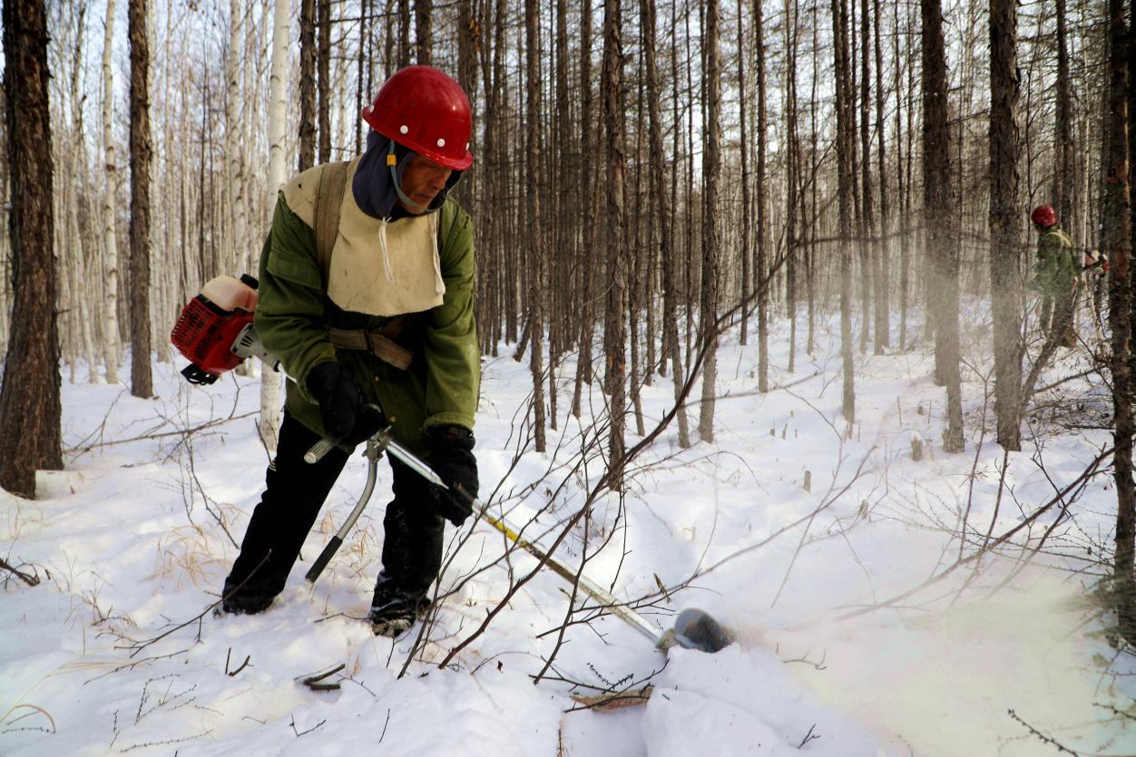 在凜冽寒風中,這些“森林園丁”手持割灌機伐除病腐木、枯立木和風折木等被害木,為目標樹和保留木騰出更多生長空間,以堅守和付出守護著林海生機。“每天收工回來,鞋子、棉褲全是濕的,但看著樹木經過修剪能茁壯成長,心中就充滿了成就感?!边B續(xù)9年參與冬季森林撫育工作的作業(yè)組組長張國生,道出了所有撫育工作人員的心聲。